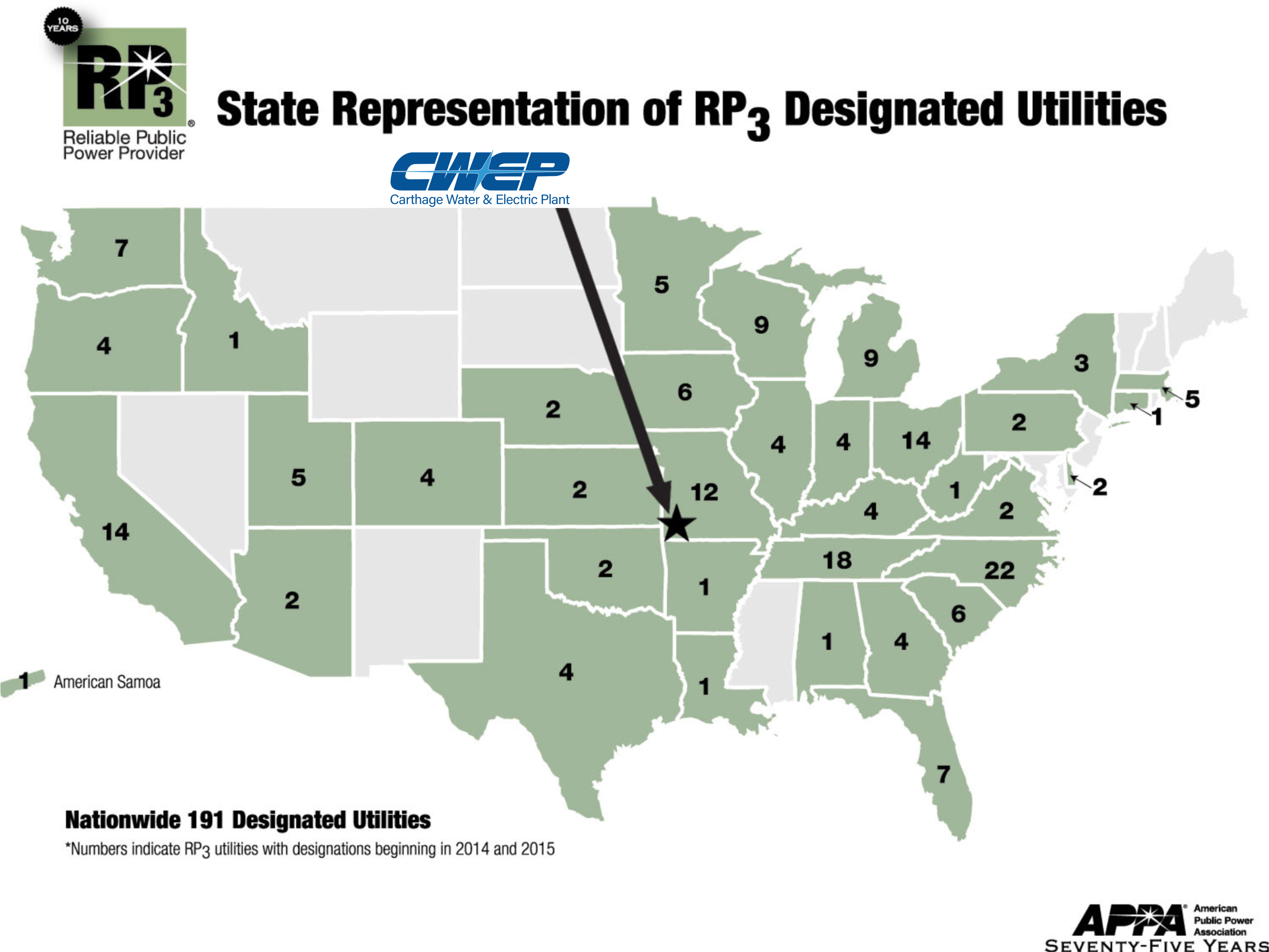 Carthage Water & Electric Plant (CWEP) is a designated Reliable Public Power Provider (RP3). This designation is presented to utilities across the U.S., from the American Public Power Association, for providing reliable and safe electric service to the communities in which they serve.
