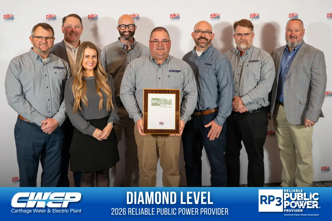 Carthage, Mo., April 9th, 2026 – Carthage Water & Electric Plant (CWEP) has once again been recognized as one of the nation’s top-performing publicly owned utilities, earning the Diamond Level Reliable Public Power Provider (RP3®) designation from the American Public Power Association (APPA).